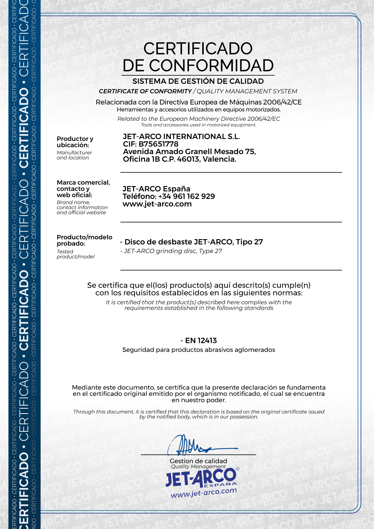 Material abrasivo: Óxido de aluminio (A24 / A30) + resina reforzada con fibra de vidrio