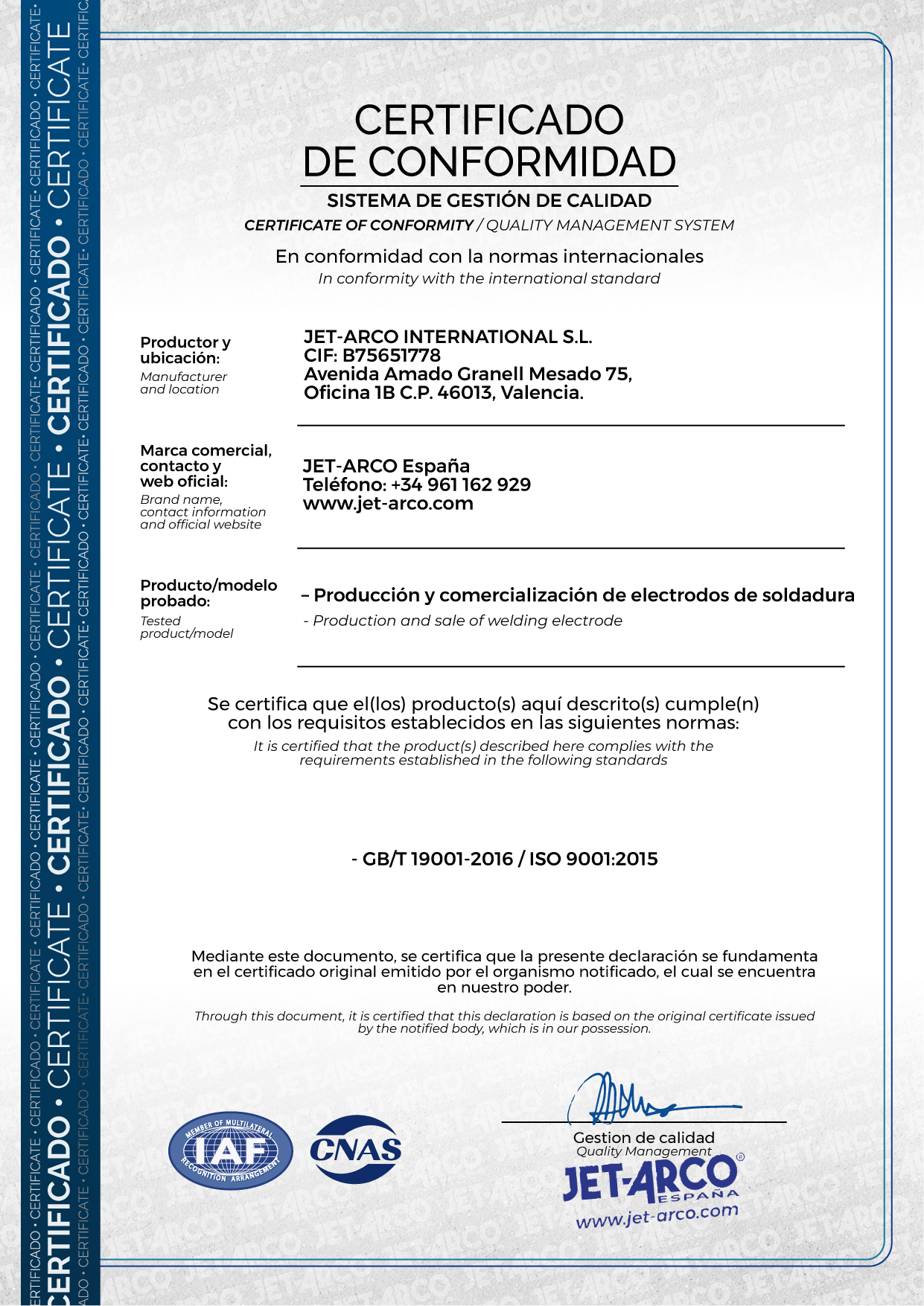 JET-ARCO Espana se reserva el derecho de modificar sin previo aviso las caracteristicas de los productos presentados en este documento, que se ofrece unicamente como guia de consulta. La seleccion y uso final de los electrodos es responsabilidad exclusiva del usuario conforme a las normativas aplicables y condiciones e