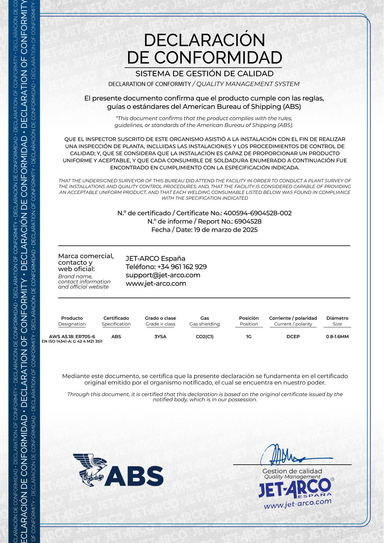| Clasificación | AWS A5.18: ER70S-6 EN ISO 14341-A: G 42 4 M21 3Si1 |